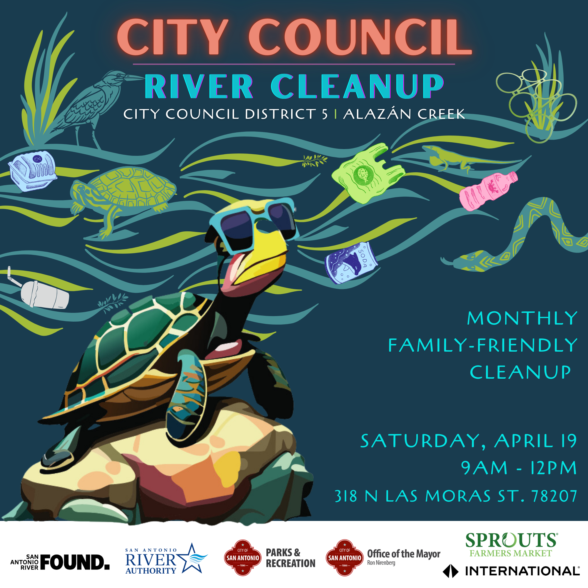 Join the San Antonio River Foundation, San Antonio River Authority, Parks and Recreation Department, Office of Mayor Ron Nirenberg, and City Council District 5, UTSA School of Business, for the City Council River Cleanup program.